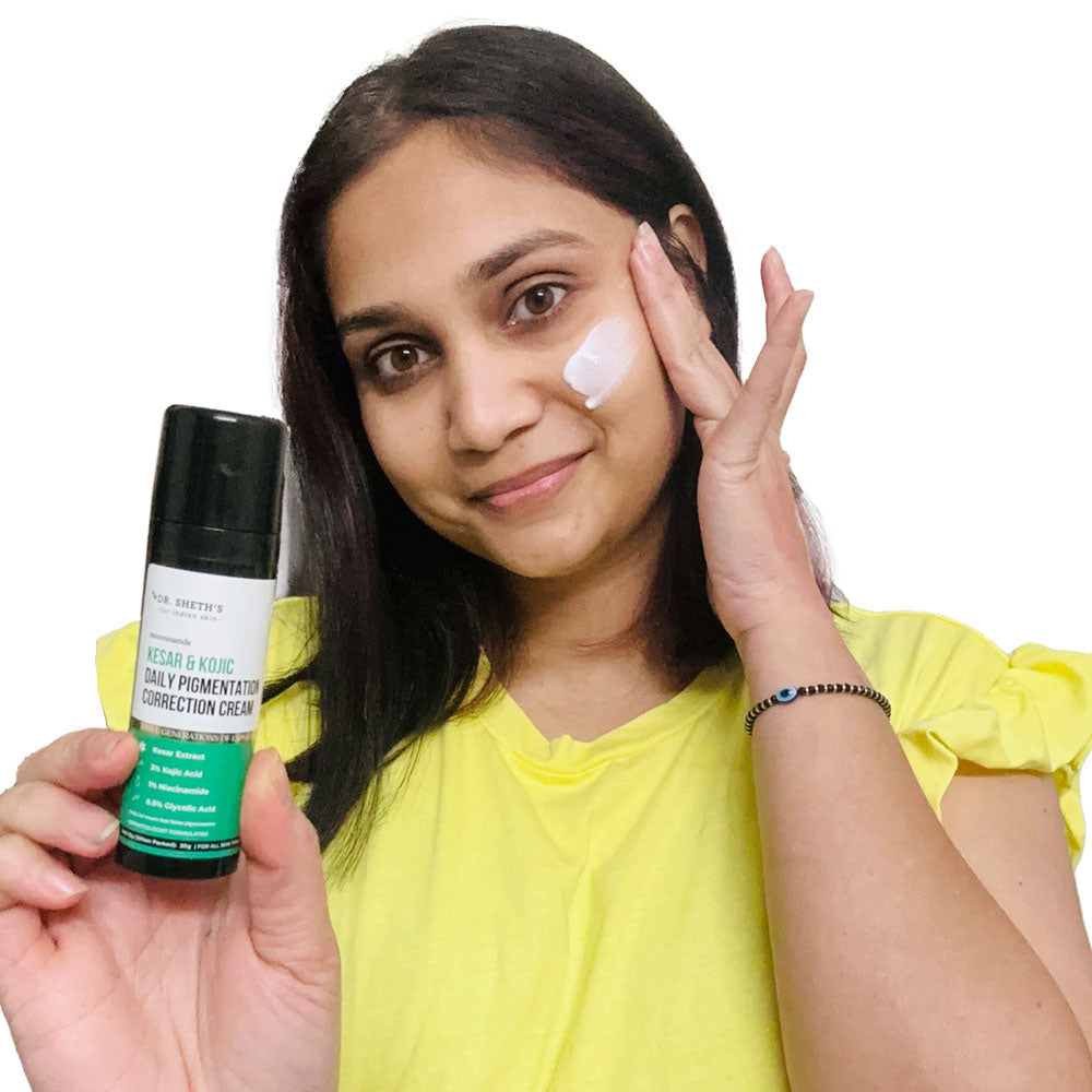 Bye Bye Pesky Pigmentation! Dr. Sheth’s Kesar & Kojic Daily Pigmentation Correction Cream is a daily use anti-pigmentation specialist cream with a non-greasy formula that battles pigmentation for blemish-free, even-toned skin. While Kojic Acid penetrates the skin to diminish dark spots & marks effectively, Niacinamide & Glycolic Acid gently exfoliate & slow down melanin synthesis. Additionally, Kesar Extract soothes inflammation & encourages smoother skin.