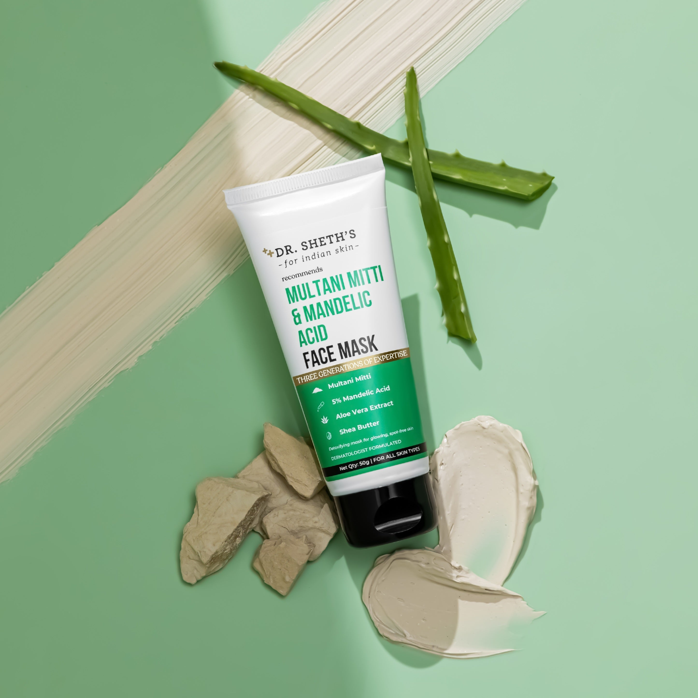 Dr. Sheth’s Multani Mitti & Mandelic Acid Face Mask is a pick-me-up for an instant glow boost! Packed with acne-fighting ingredients like Mandelic Acid & Multani Mitti, this unique blend of age-old ingredients & potent active deeply cleanses & gets rid of excess oil for clear, pimple-free skin. Aloe Vera & Shea Butter help in nourishing the skin while preventing acne formation. Say bye-bye to breakouts & mask up to meet spotless skin!