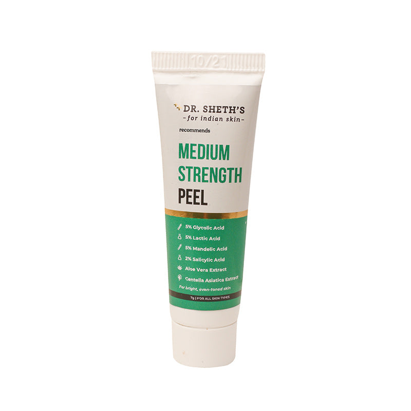 The Dr. Sheth’s Medium Strength Peel is a powerful yet judicious formulation of AHAs (Lactic Acid, Glycolic Acid and Mandelic Acid) and BHA (Salicylic Acid) which evenly exfoliate the surface of your skin. Natural extracts like Aloe Vera and Centella Asiatica soothe and calm skin post exfoliation, leaving it bright and fresh.